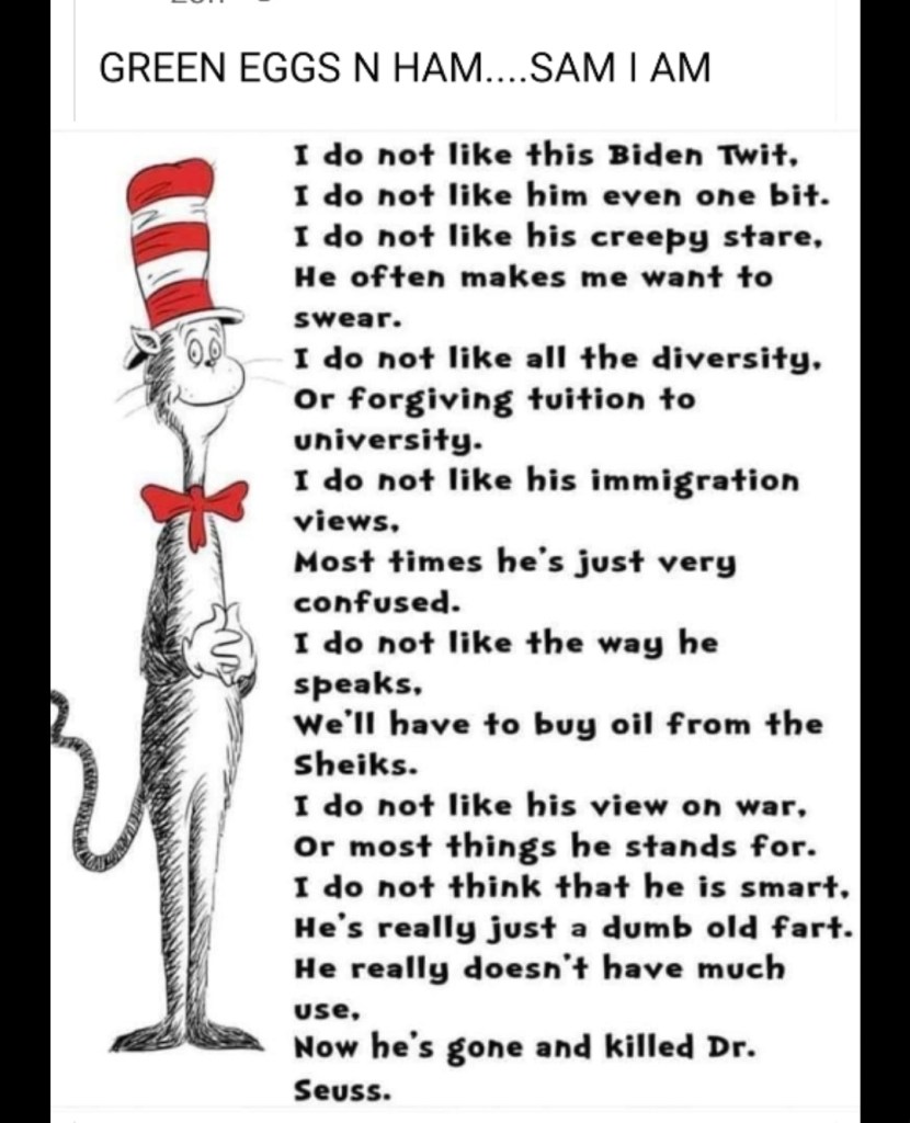Heres another example how this regime is canceled out our lives by now burning books of Dr Suess, check out this video! Where the Obamas are reading to the kids. https://youtu.be/L8unI_VojJE